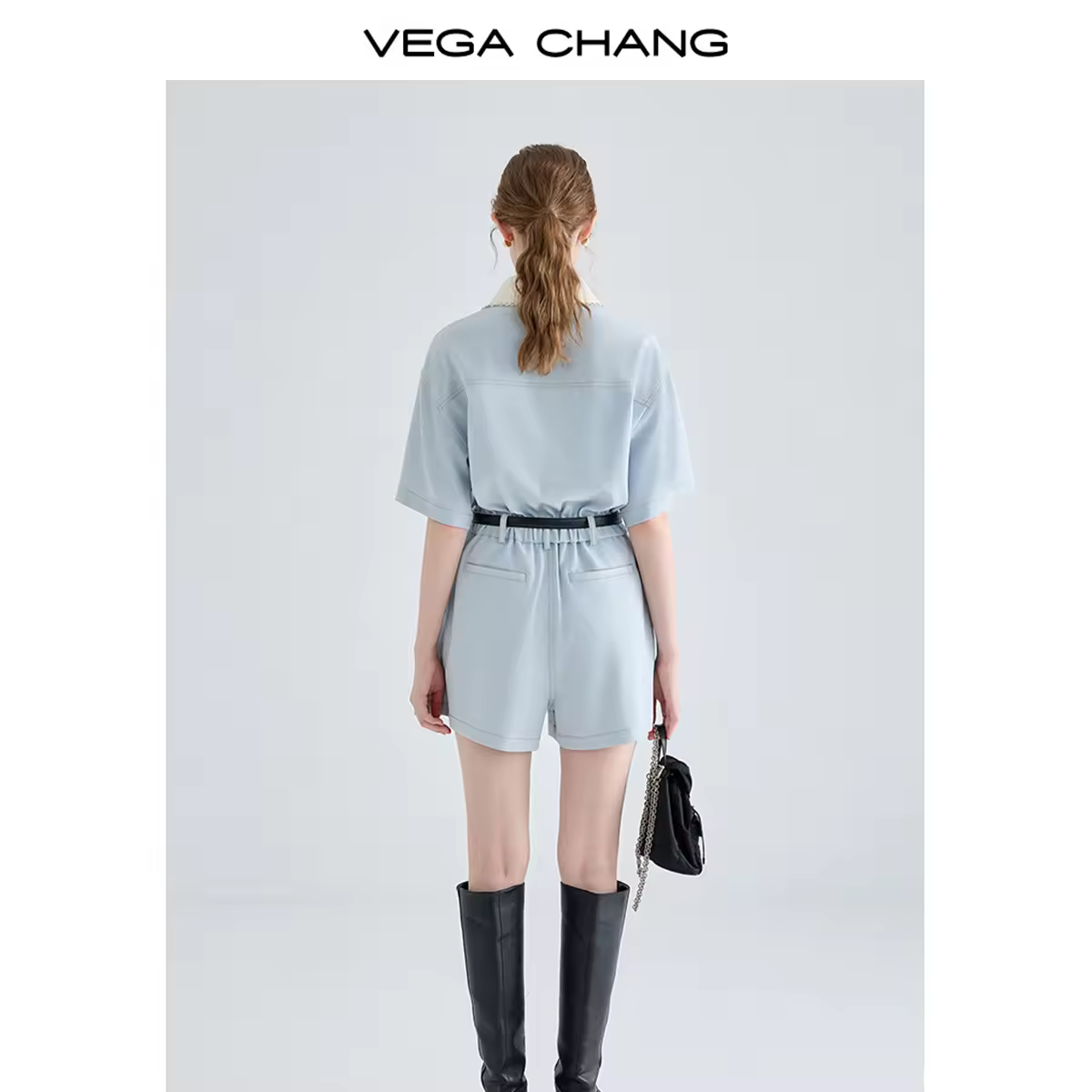 This fresh summer romper combines crisp shirt collar sophistication with playful youthful charm. The short sleeves and tailored bodice create a polished silhouette, while the shorts cut keeps things fun and flirty—perfect for effortless warm-weather style.