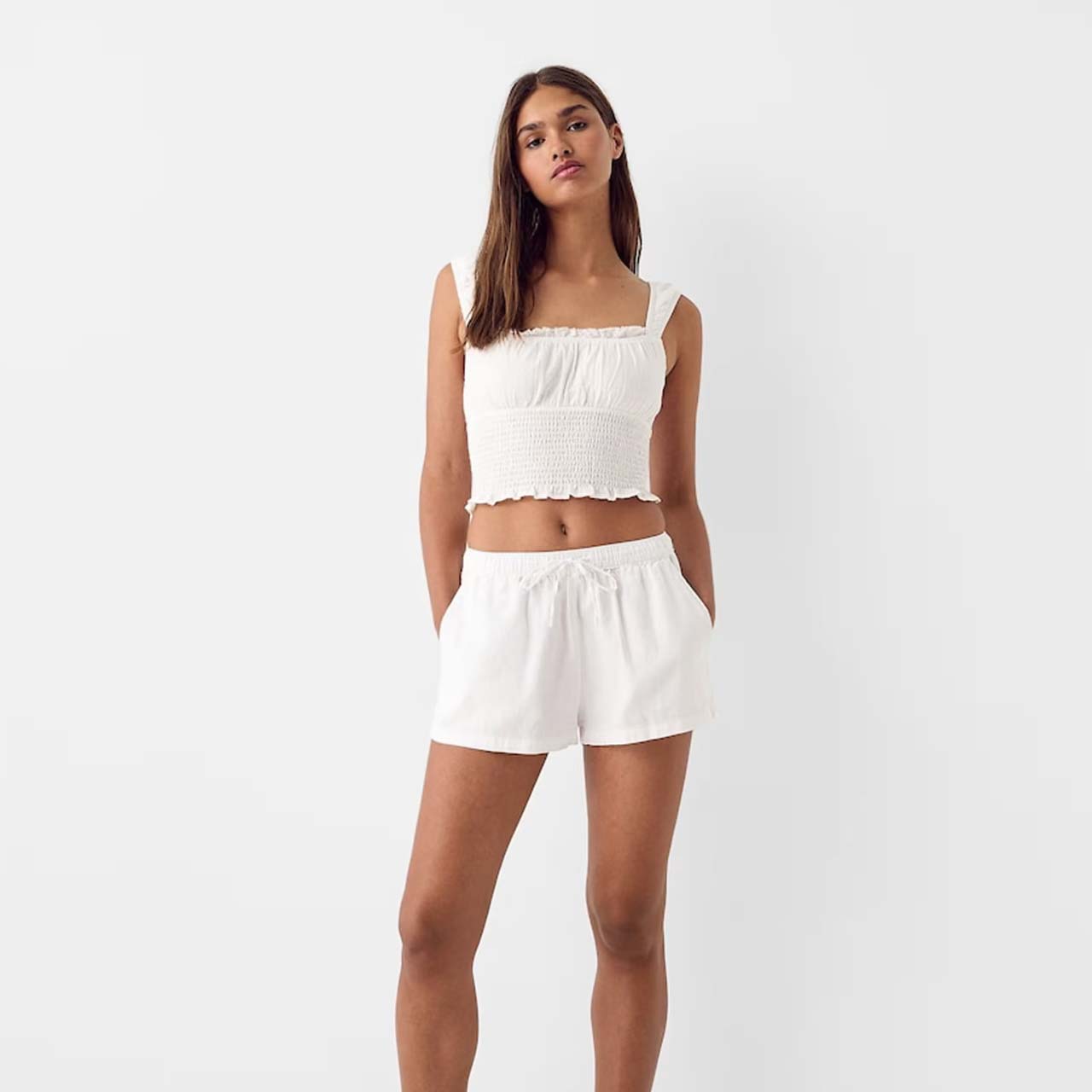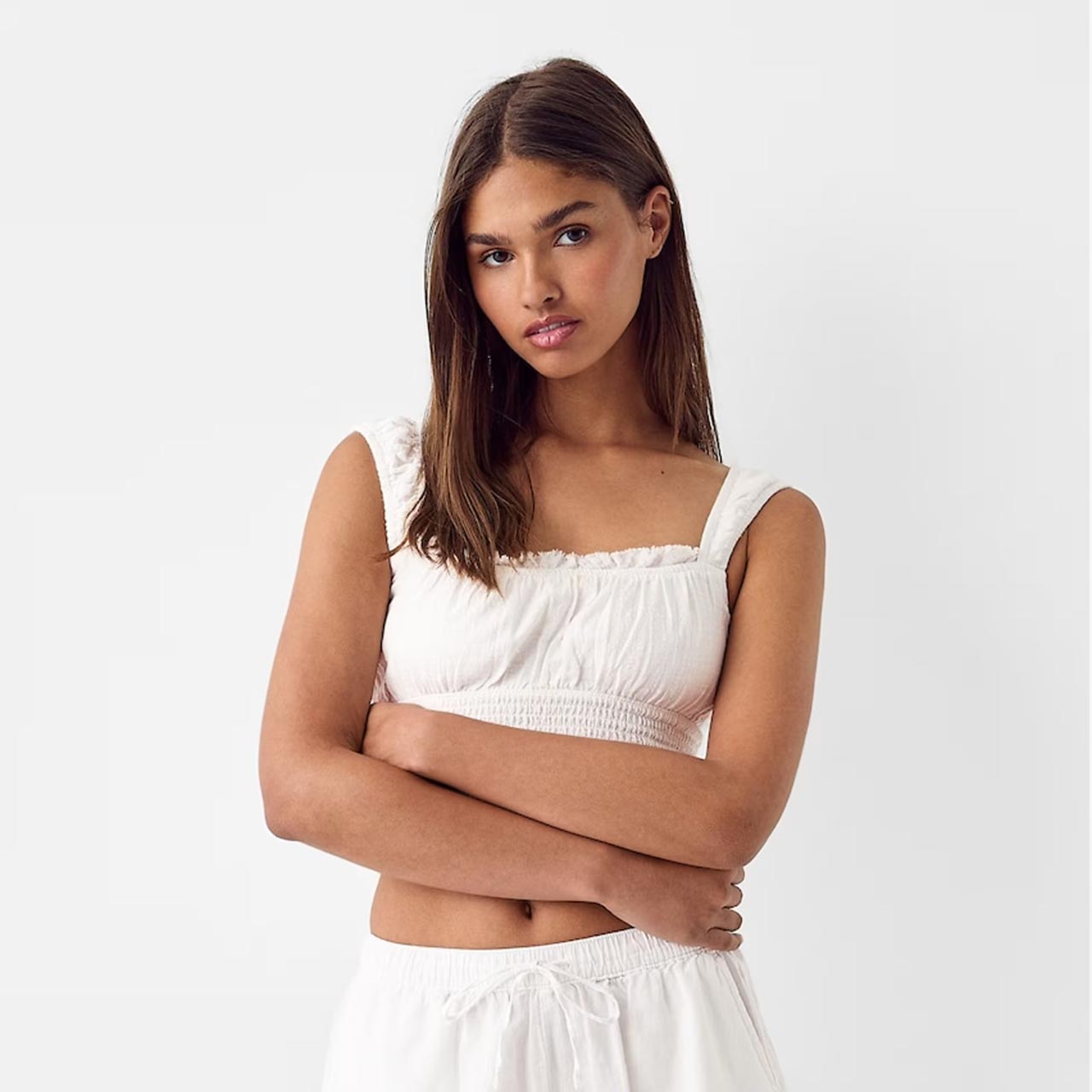The shoulder straps feature a subtle ruffled edge that adds texture without bulk. Combined with the square neckline, the cut frames the collarbone and stays in place without constant readjustment.